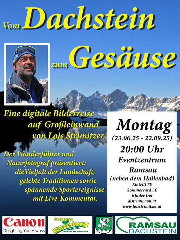 Als Wanderführer und leidenschaftlicher Naturfotograf ist Lois Strimitzer mit Begeisterung und Freude ständig unterwegs, um Schätze und Schönheiten im Steirischen Ennstal zu erkunden. Der Reiz der Landschaft, sowie gelebte Traditionen und spannende Sportereignisse, sind verpackt in eine 1 1/4 stündige, informative und unterhaltsame Diashow.